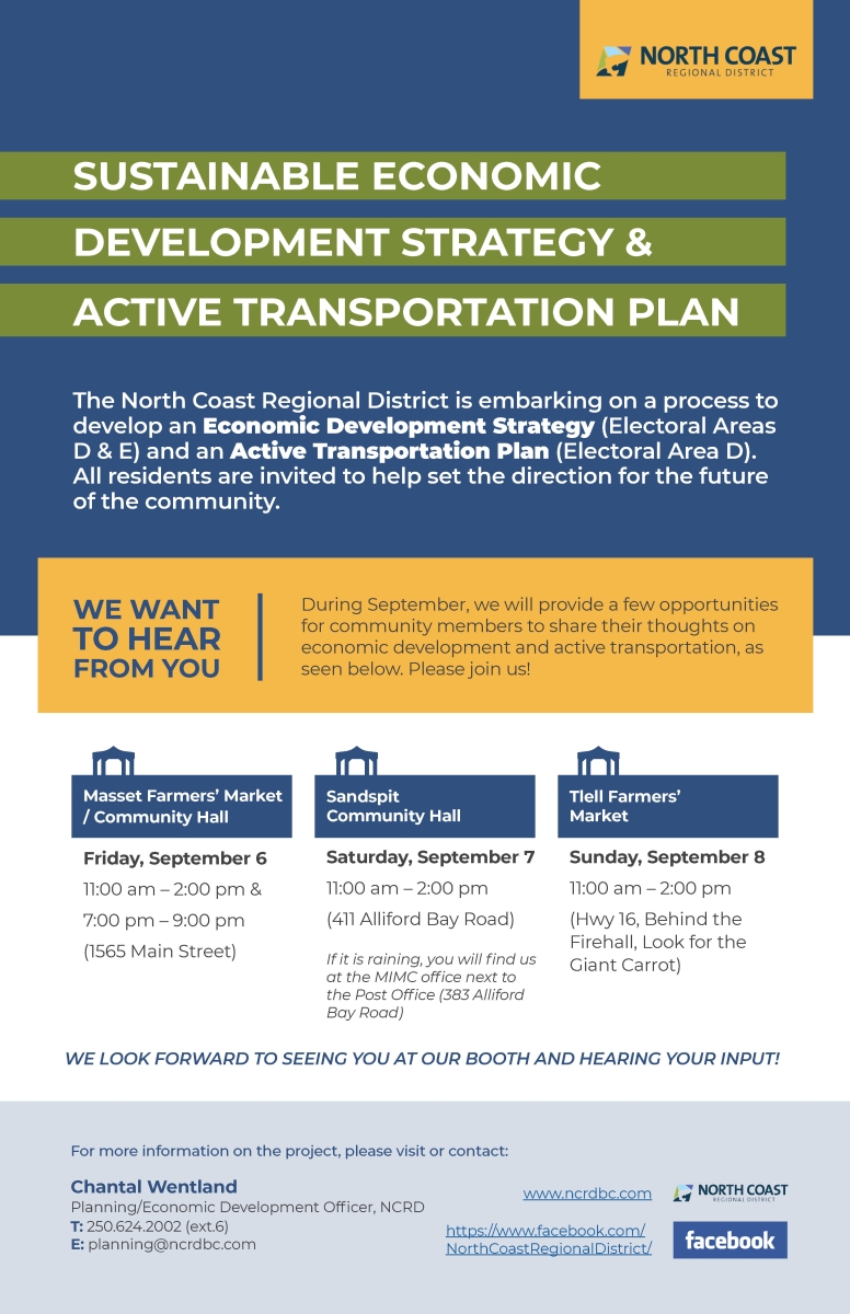 The North Coast Regional District is embarking on a process to develop an Economic Development Strategy (Electoral Areas D & E) and an Active Transportation Plan (Electoral Area D). All residents are invited to help set the direction for the future of the community.